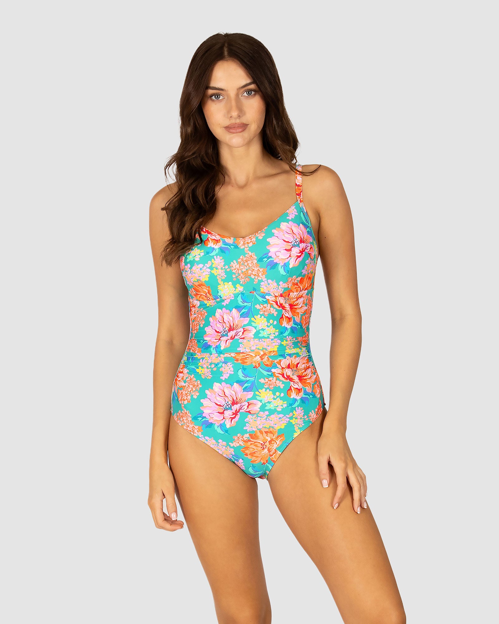 Baku's Le Jardin D-E Underwire One Piece Swimsuit features hidden underwire support with power mesh stability, lycra cup support and added boning for support. It has adjustable and convertible straps and flattering tummy ruching. It also has power mesh tummy control for a flattering fit.