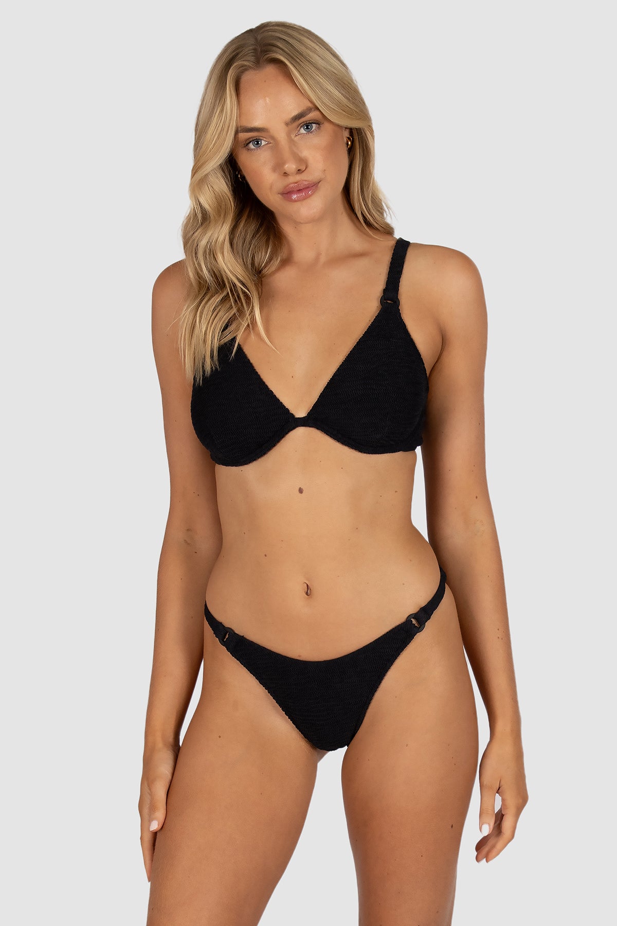 Baku's Ibiza Brazilian Bikini Pant features a rings front detail with Brazilian bottom coverage. Our exciting new solid Ibiza is crafted from a vibrant and dynamic crinkle fabric with a tactile texture, made in Italy.
