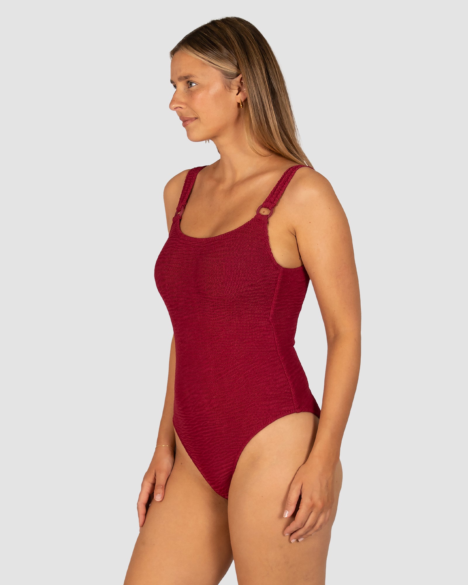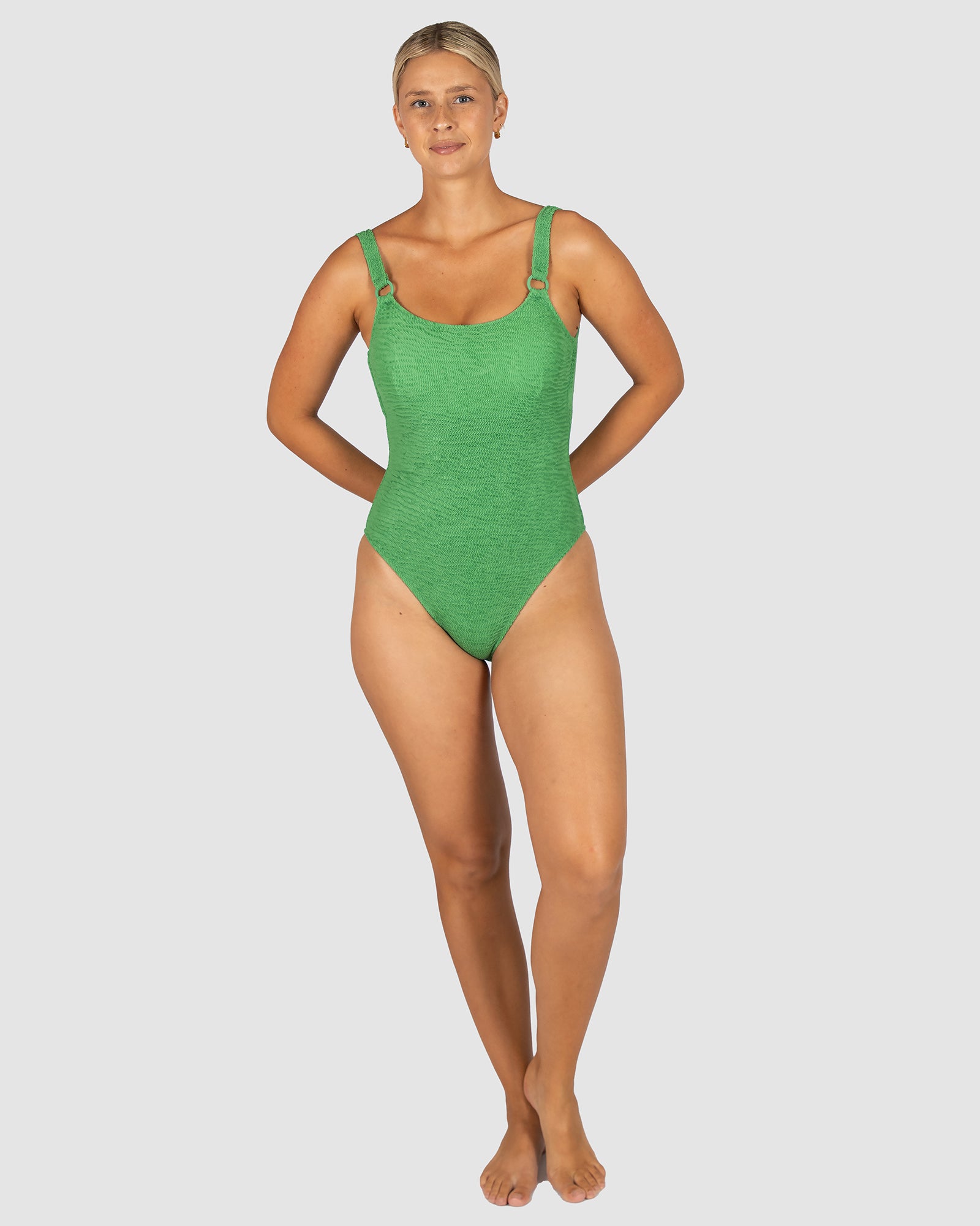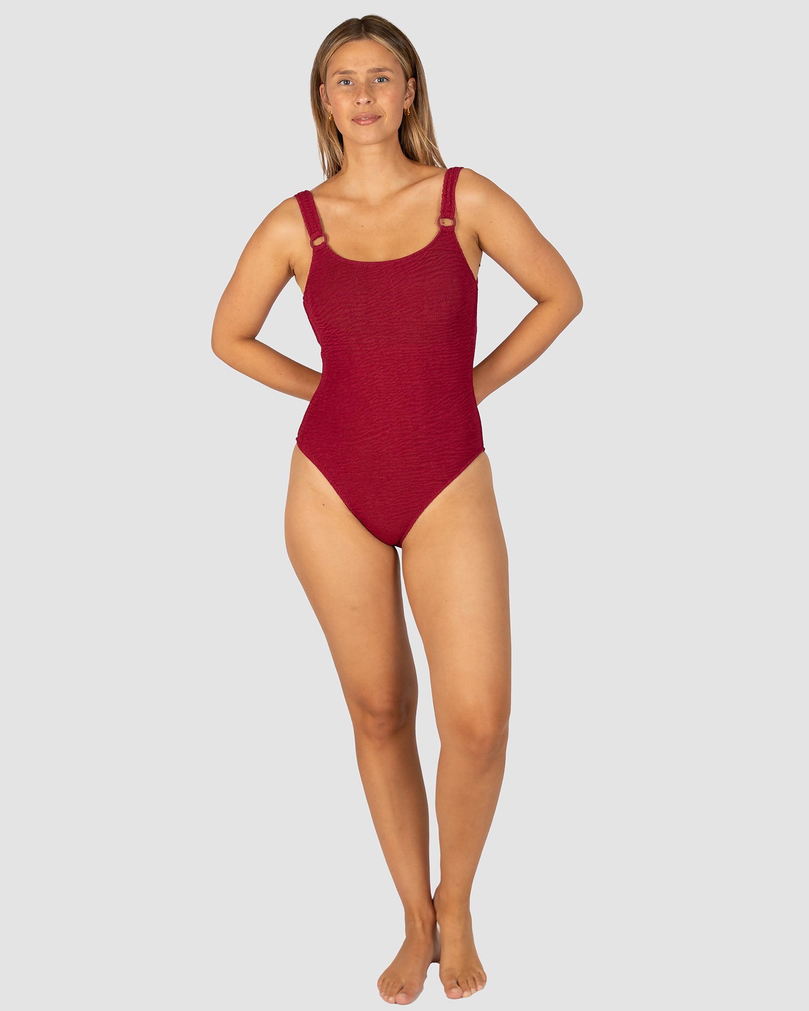 Baku's D/E Cup Underwire One Piece Swimsuit features a flattering hidden underwire, shelf support, flattering low scoop back, fully lined and ring detailing. Our exciting new solid Ibiza is crafted from a vibrant and dynamic crinkle fabric with a tactile texture, made in Italy.
