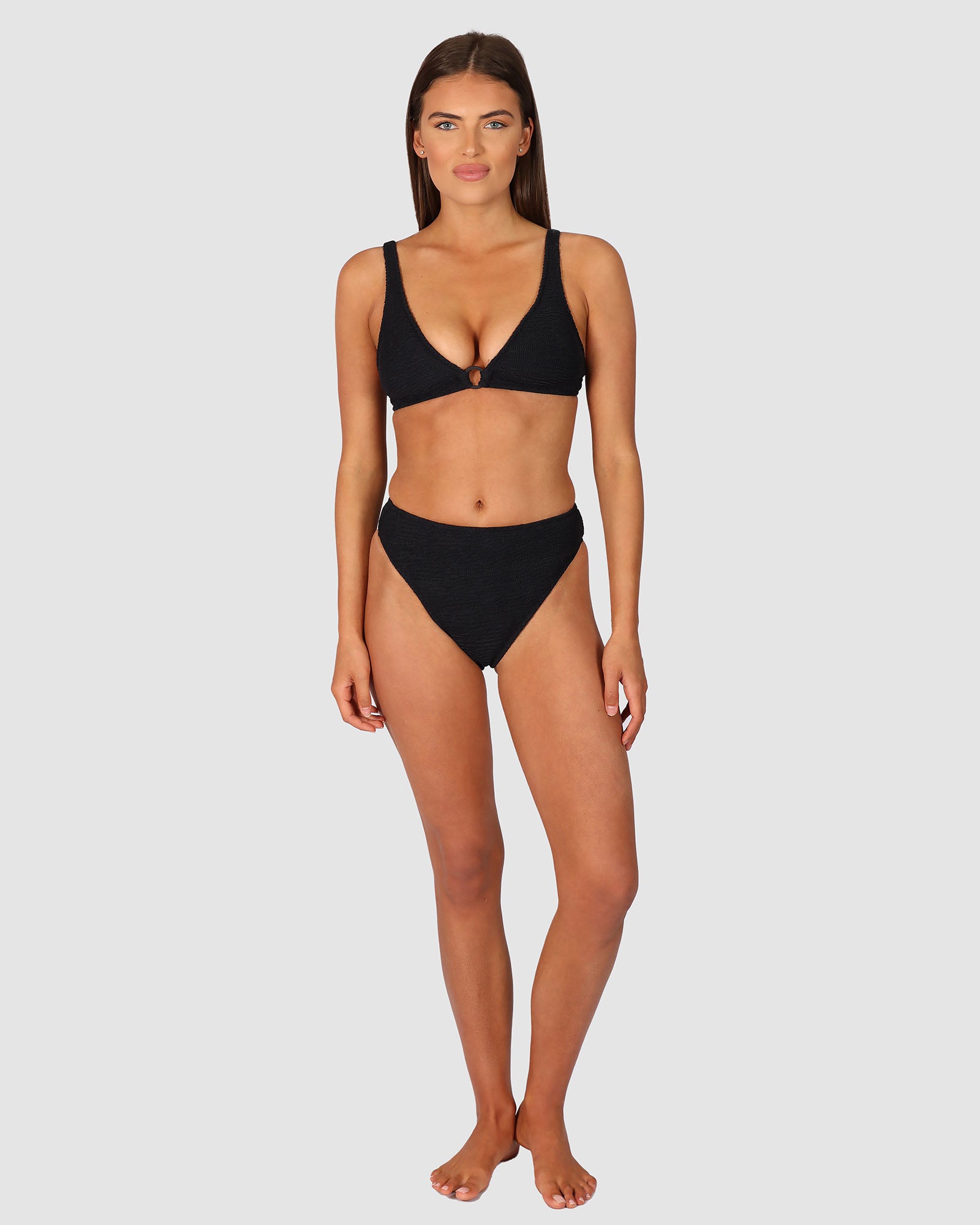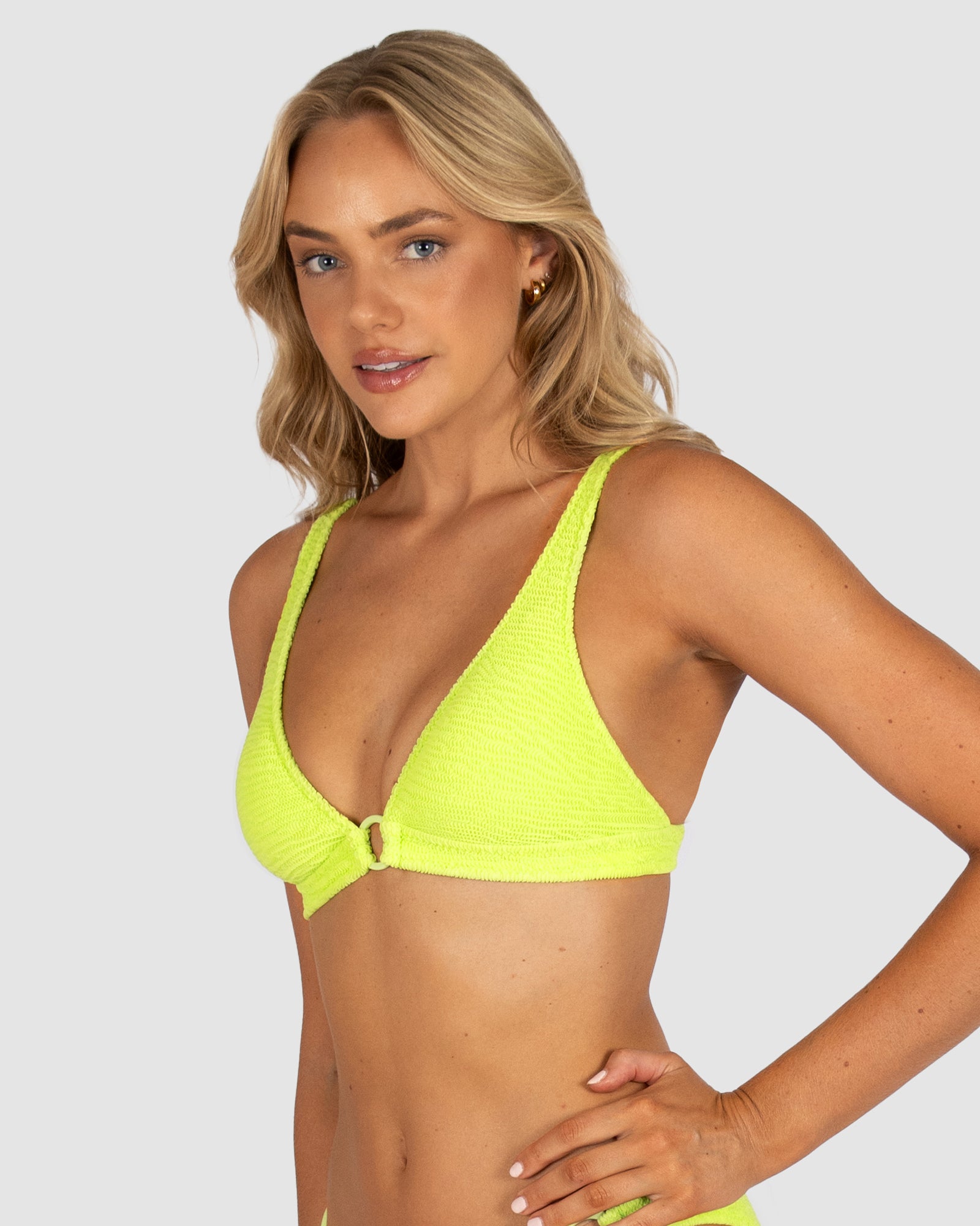 Baku's Ibiza Ring Front Bra Bikini Top features a flattering dropped neckline that connects with a ring. It also features removable cups, boning support, adjustable straps and fastens with a clip back. Our exciting new solid Ibiza is crafted from a vibrant and dynamic crinkle fabric with a tactile texture, made in Italy.