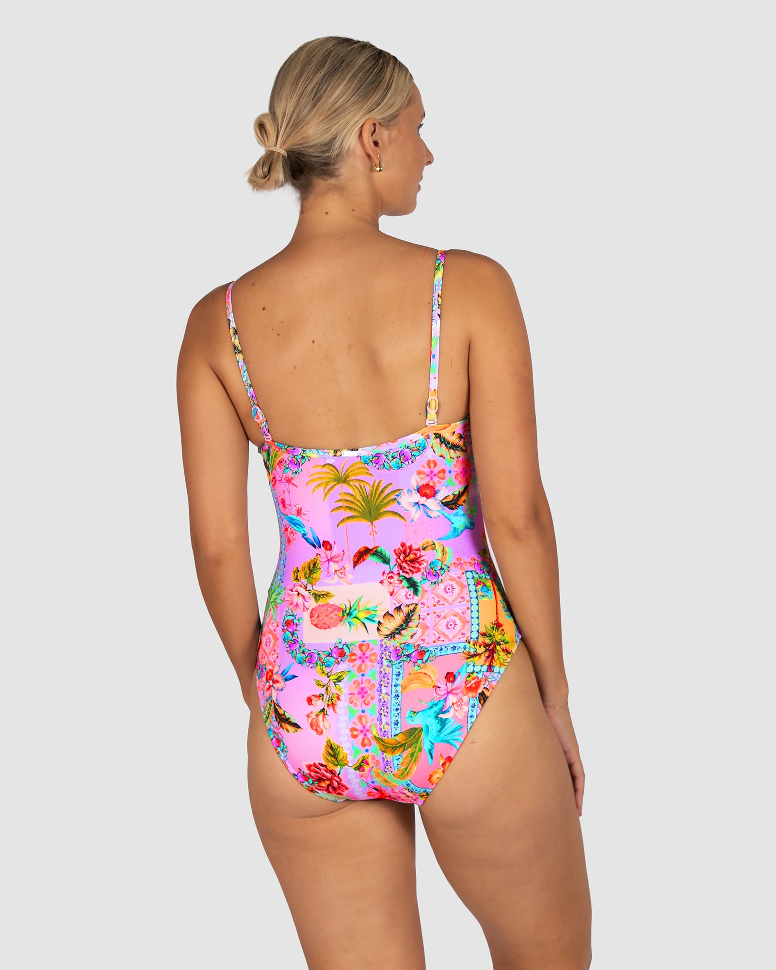 Baku's Sardinia D–E Cup Tie Front One Piece Swimsuit offers hidden underwire and shelf support for a secure and flattering fit. Featuring a soft tie front detail, inner cup Lycra lining for added stability, tummy control panel, and adjustable convertible straps, this style is designed for D–E cup support
