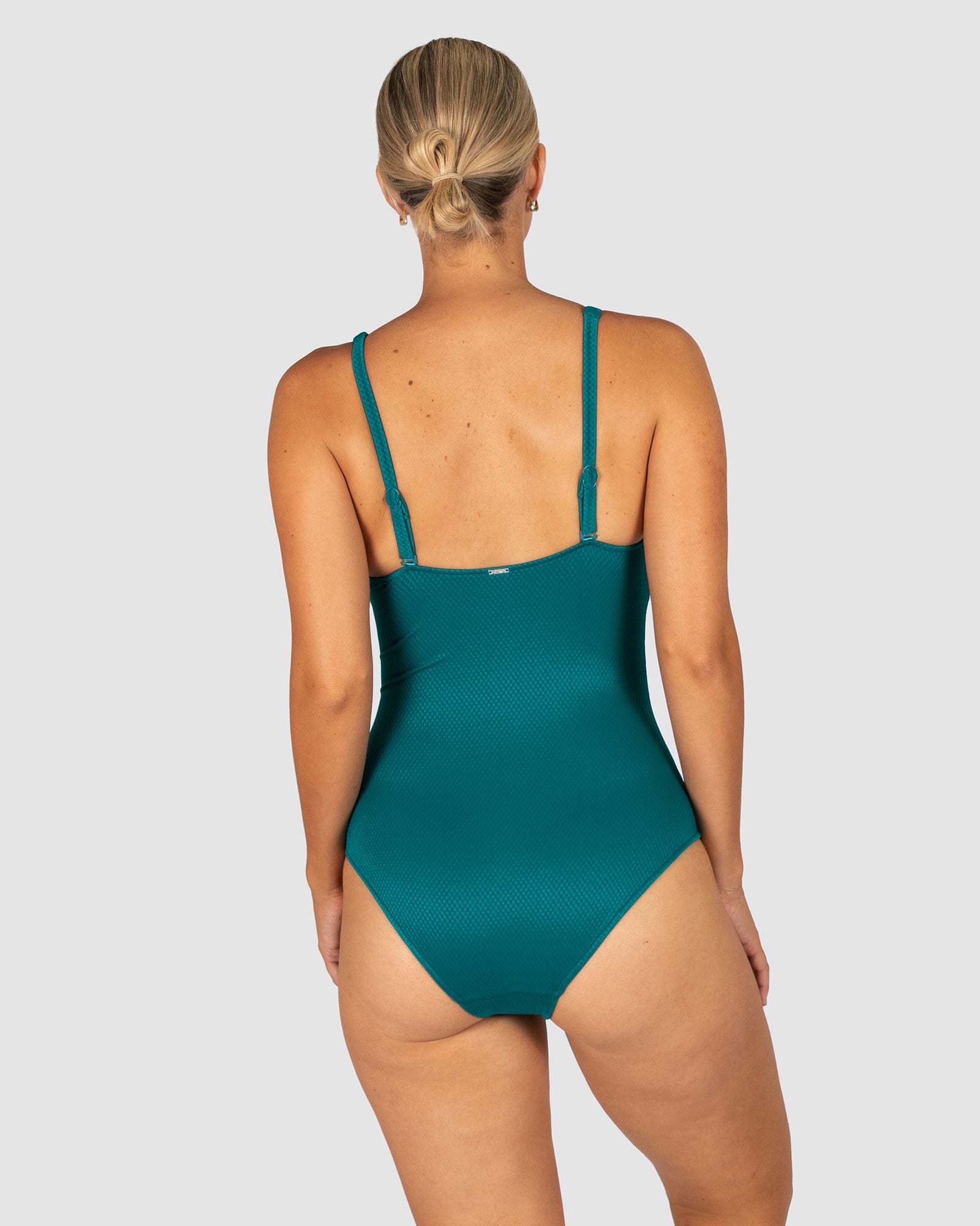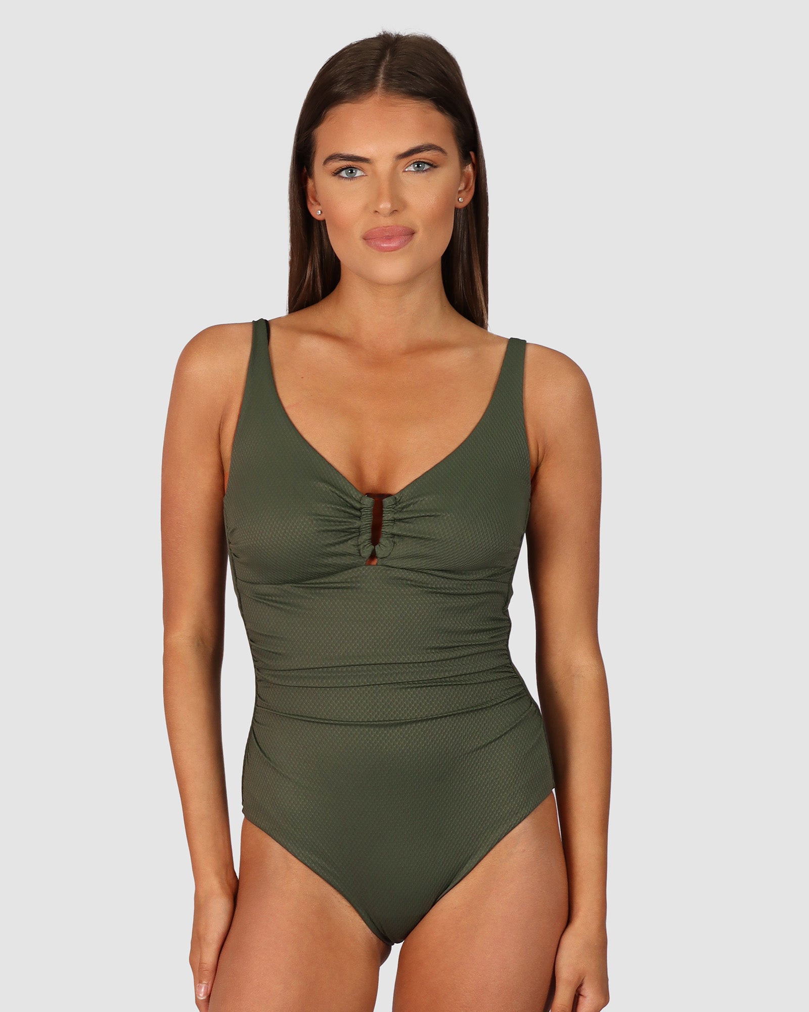 Baku's Rococco D/E Ring Front One Piece Swimsuit features a flattering dropped neckline with a tortoise shell ring at the front. It has hidden underwire with power mesh stability, boning and continuous shelf support. It also features a soft edge front, adjustable straps, tummy control & ruching and is fully lined.